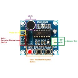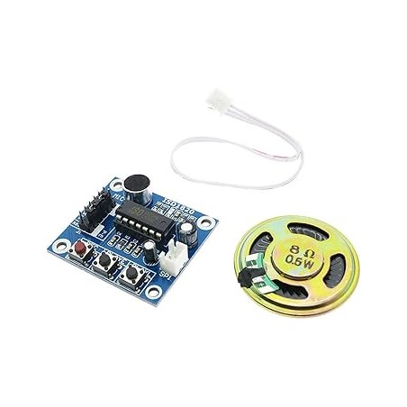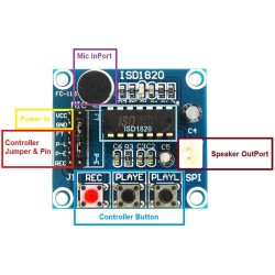 وحدة إلكترونية متكاملة للتسجيل الصوتي وإعادة تشغيله، تعتمد على شريحة ISD1820. تتميز هذه الوحدة بوجود ذاكرة فلاش مدمجة تحتفظ بالبيانات لمدة تصل إلى 100 عام مع إمكانية إعادة التسجيل حتى 100,000 دورة . يمكن استخدامها إما في الوضع المستقل (Standalone) عبر أزرارها المدمجة، أو التحكم بها بواسطة متحكم خارجي (Microcontroller-driven) مثل Arduino، مما يجعلها مثالية لمشاريع التسجيل الصوتي، أجهزة الإنذار الصوتية، والألعاب التفاعلية.