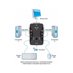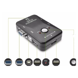 Selector with connection from 2 computers to one monitor and parallel USB keyboard, mouse and flash memory connection.