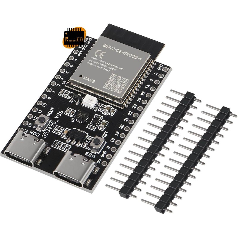 Advanced ESP32-C6 Wi-Fi & Bluetooth Combination: This development board combines both advanced Wi-Fi connectivity with high-performance Bluetooth capabilities, making it ideal for IoT applications where reliable communication protocols are essential. It supports dual-band (2.4GHz + 5GHz) operation which ensures stable internet connection speeds even under heavy loads or crowded networks.