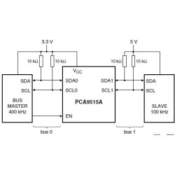 The PCA9515A also can be used to run two buses: one at 5V interface levels and the other at 3.3V interface levels, or one at 400kHz operating frequency and the other at 100kHz operating frequency.